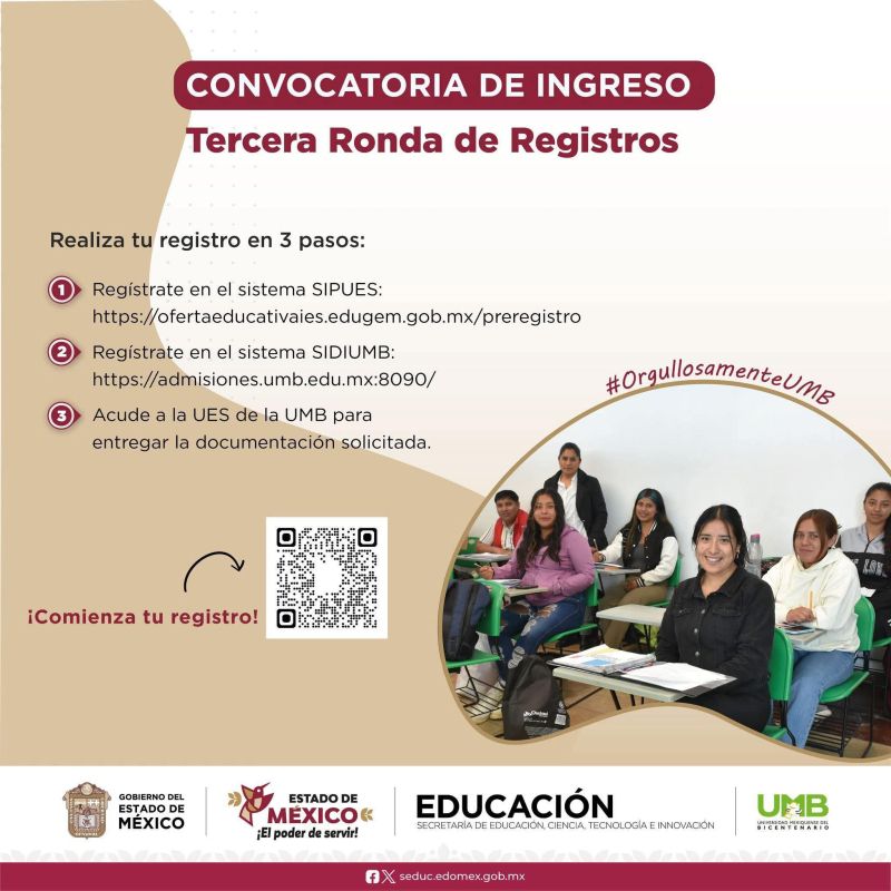 Aún estás a tiempo de participar en la Tercera Ronda del Prerregistro para Nuevo Ingreso a la UES_Luvianos. ???? Tienen hasta el 8 de agosto de 2025 para realizar su registro a través del siguiente enlace: https://ofertaeducativaies.edugem.gob.mx/preregistro ¡No olviden consultar la convocatoria escaneando el código QR! ⬇️ #OrgullosamenteUMB