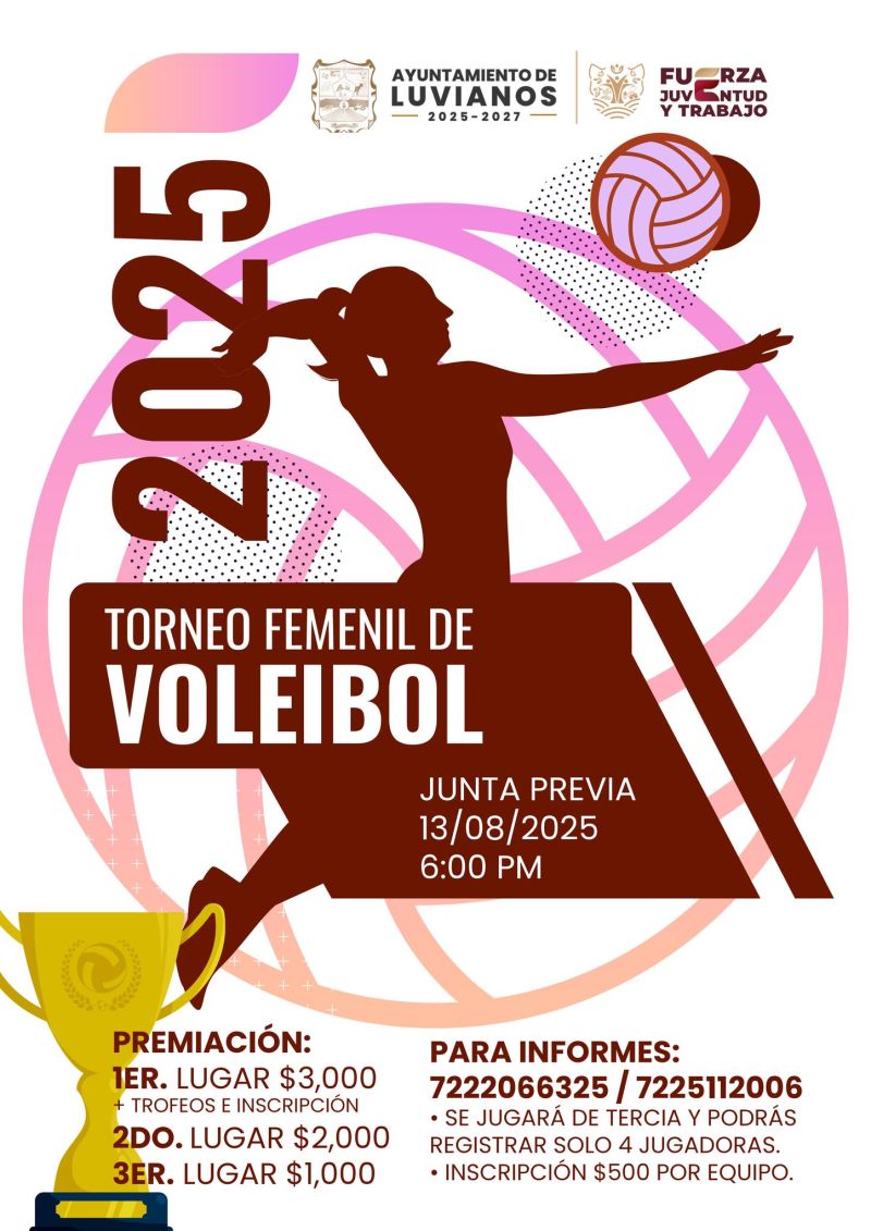 ¡El voleibol se vive en Luvianos! ¿Estás listo para demostrar tu talento en la cancha? El Ayuntamiento de Luvianos, a través de la Primera Regiduría y el IMCUFIDEL, te invita a participar en el Torneo Varonil y Femenil de Voleibol 2025 Junta Previa: 13 de agosto de 2025 6:00 PM Premiación: 1er lugar: $3,000 + trofeos e inscripción 2do lugar: $2,000 3er lugar: $1,000 Inscripción: $500 por equipo Solo podrás registrar 4 jugadores/as Informes al: 7222066325 / 7225112006 ¡Se jugará de tercia, así que arma tu equipo y participa!