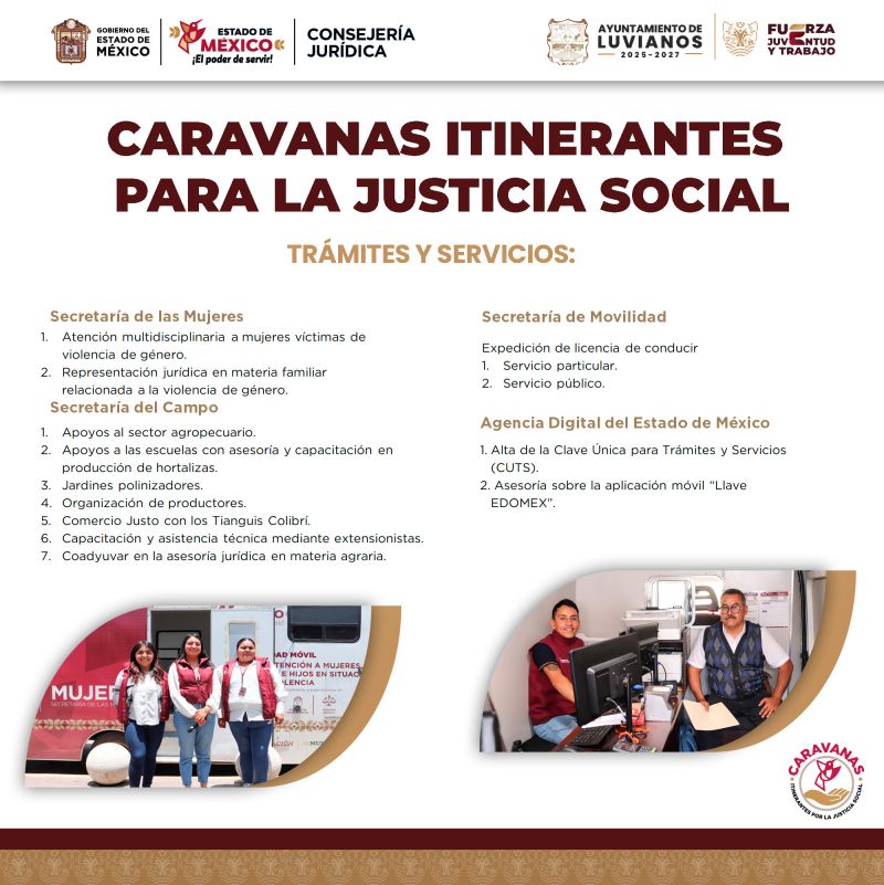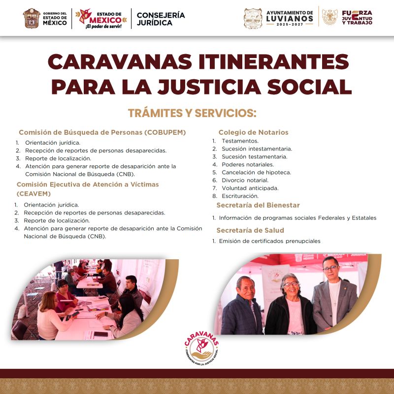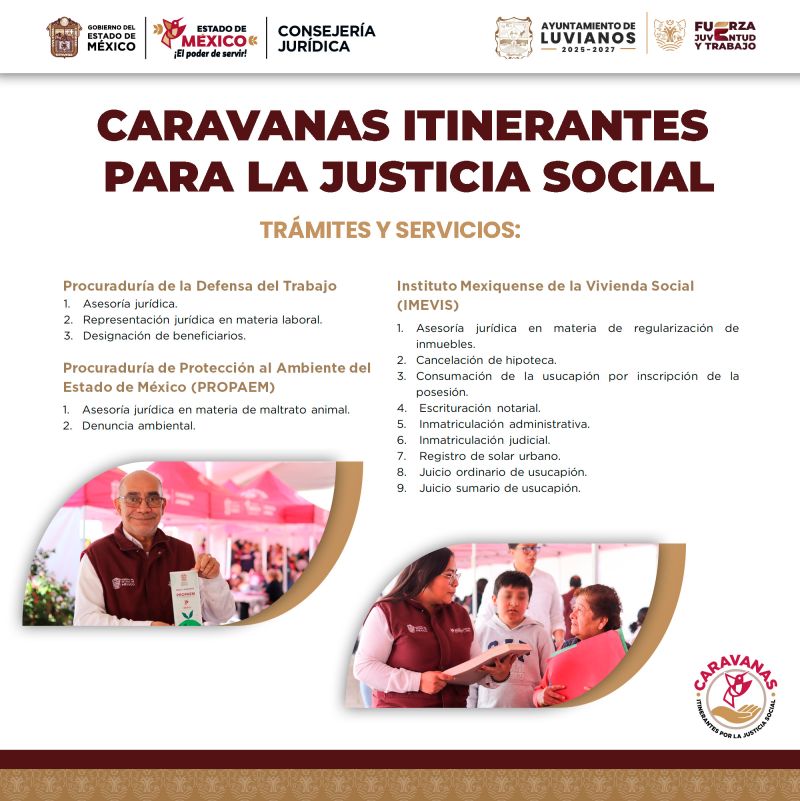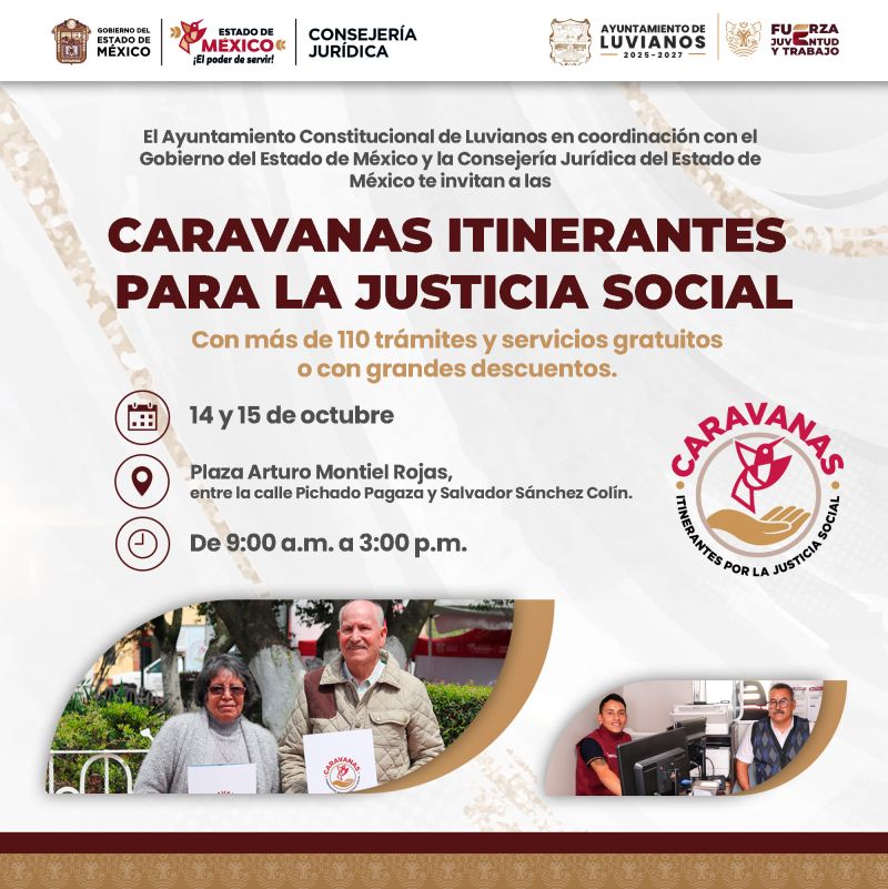 ¡Las Caravanas Itinerantes para la Justicia Social, llegan a Luvianos este 14 y 15 de octubre! Luvianos recibirá este importante programa que acerca a más de 110 trámites y servicios, en su mayoría gratuitos del Gobierno del Estado de México y del Gobierno de México. Agradecemos el apoyo del Mtro. Jesús George Zamora, Consejero Jurídico del Estado de México, asimismo, del Lic. Rodolfo Isai González López, Director General de Justicia Cotidiana y de nuestra Gobernadora, la Mtra. Delfina Gómez Álvarez, por poner todos estos servicios al alcance de todas y todos.