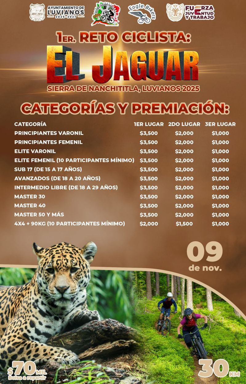 Unidos fomentamos el deporte, la cultura y el turismo en nuestro municipio. En coordinación con el Club de Ciclismo Jaguares Nanchititla y Eagle Bikers, les extendemos una cordial invitación a participar en el Primer Reto Ciclista “El Jaguar”, que se llevará a cabo en la majestuosa Sierra de Nanchititla, Luvianos, México. Una experiencia única, familiar y llena de diversión. ¡Los esperamos este 9 de noviembre en el municipio de Luvianos
